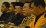 REPUBLIKA.CO.ID, JAKARTA -- Ketua Umum Pimpinan Pusat Kolektif (PPK) Kosgoro 1957 yang juga Wakil Ketua Umum Partai Golkar Agung Laksono memberikan keterangan pers soal hasil Musyawarah Pimpinan Nasional Kosgoro 1957 Tahun 2014 di Jakarta, Ahad (14/9).