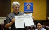 Panitia Seleksi (Pansel) pimpinan KPK Imam B. Prasodjo (kiri) menunjukan surat berisi nama hasil seleksi calon pimpinan KPK di Gedung Kementerian Hukum dan HAM, Jakarta, Senin (15/9). (Republika/ Wihdan)