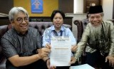 (dari kiri) Panitia Seleksi (Pansel) pimpinan KPK Imam B. Prasodjo, Harkristuti Harkrisnowo, dan Abdullah Hehamahua menunjukan surat berisi nama hasil seleksi calon pimpinan KPK di Gedung Kementerian Hukum dan HAM, Jakarta, Senin (15/9). (Republika/ Wihd