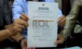 Panitia Seleksi (Pansel) pimpinan KPK menunjukkan surat berisi nama hasil seleksi calon pimpinan KPK di Gedung Kemenkumham, Jakarta, Senin (15/9). (Republika/ Wihdan)