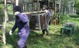Dua pekerja membawa Lutung Jawa (Trachypitecus Auratus) dari kandang sosialisasi untuk menjalani pemeriksaan kesehatan di Javan Langur Centre, Coban Talun, Malang, Jawa Timur, Senin (15/9). (Antara/Ari Bowo Sucipto)