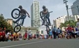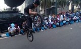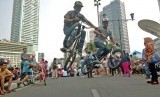 REPUBLIKA.CO.ID, JAKARTA -- Dua orang anggota komunitas BMX Jakarta melakukan aksi free style di Bundaran HI, Jakarta Pusat, Ahad (21/9).