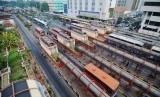 Suasana naik turun penumpang di Terminal Bus Blok M, Jakarta Selatan, Senin (13/10). (Republika/Raisan Al Farisi)