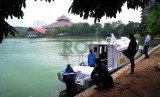 REPUBLIKA.CO.ID, DEPOK -- Petugas kru Kapal Triwitono mengopersaikan Kapal di danau kampus UI, Depok, Jawa Barat, Senin (13/10).