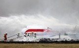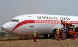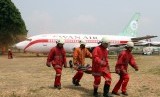 REPUBLIKA.CO.ID, TANGERANG -- Sejumlah petugas pemadam kebakaran melakukan evakuasi penumpang yang selamat sesaat setelah pesawat Swan Air RR-253 mendarat dan terbakar, saat simulasi penanggulangan keadaan darurat di Bandara Soekarno Hatta, Tangerang, Banten, Kamis (16/10).