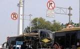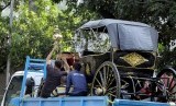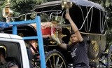 REPUBLIKA.CO.ID, JAKARTA -- Pekerja membawa kereta kencana mengunakan mobil bak terbuka melintas dikawasan Monas, Jakarta, Ahad (19/10).