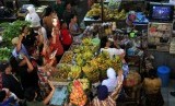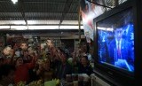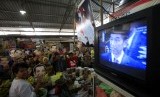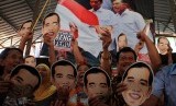 REPUBLIKA.CO.ID, SOLO -- Sejumlah pedagang dan pengunjung mengenakan topeng bergambar Jokowi saat menonton bersama melalui TV acara pelantikan Presiden, Joko Widodo dan wakilnya, Jusuf Kalla di Pasar Gede, Solo, Jawa Tengah, Senin (20/10).