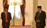 Presiden Joko Widodo didampingi Presiden ke-6 RI Susilo Bambang Yudhoyono memberikan sambutan usai Upacara Penyambutan di Istana Merdeka, Jakarta, Senin (20/10). (Republika/Prayogi)