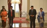 Presiden Joko Widodo bersama Presiden RI Ke-6 Susilo Bambang Yudhoyono saat upacara penyambutan Presiden di Istana Merdeka, Jakarta, Senin (20/10). (Republika/Prayogi)