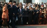 Presiden Joko Widodo bersama Presiden RI Ke-6 Susilo Bambang Yudhoyono bersalaman dengan para tamu undangan saat acara pisah sambut di Istana Merdeka, Jakarta, Senin (20/10). (Republika/Prayogi)