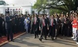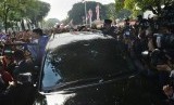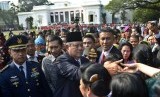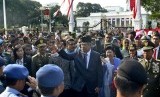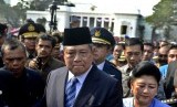 REPUBLIKA.CO.ID, JAKARTA -- Presiden ke-6 RI Susilo Bambang Yudhoyono dan Ibu Ani Yudhoyono menyapa warga saat meninggalkan Istana Merdeka, Jakarta, Senin (20/10).