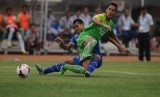 Pemain Persib Tantan (bawah) berebut bola dengan pemain Persebaya Novri Setiawan (atas) pada laga lanjutan delapan besar group L Indonesia Super League di Stadion Si Jalak Harupat, Kabupaten Bandung, Rabu(22/10).(foto: Septianjar Muharam)