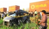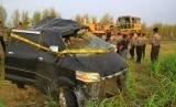 Sejumlah petugas melakukan olah kejadian perkara di lokasi terjadinya tabrakan antara mini bus dan kereta api Cirebon Ekspres di perlintasan tanpa palang pintu desa Mundu, Kabupaten Cirebon, Jawa Barat, Rabu (22/10).(Antara/Dedhez Anggara)