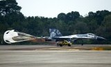 Jet tempur Sukhoi SU27 milik TNI AU melepaskan rem parasut ketika melaksanakan latihan di Bandara Internasional Hang Nadim, Batam, Selasa (28/10). (Antara/Joko Sulistyo)