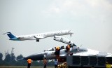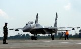 Prajurit TNI AU memandu jet tempur Sukhoi SU30 yang melaksanakan latihan di Bandara Internasional Hang Nadim, Batam, Selasa (28/10). (Antara/Joko Sulistyo)
