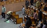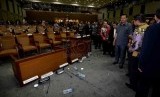 Sejumlah anggota dewan menyaksikan meja Ketua Fraksi PPP Hasrul Azwar yang terbalik saat rapat paripurna terkait pengesahan alat kelengkapan dewan (AKD) di Gedung Nusantara II, DPR, Jakarta, Selasa (28/10). (Republika/Agung Supriyanto)