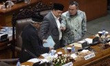 Ketua Fraksi PPP Hasrul Azwar (kiri) meninggalkan ruang rapat usai membalik meja rapat saat rapat paripurna terkait pengesahan alat kelengkapan dewan (AKD) di Gedung Nusantara II, DPR, Jakarta, Selasa (28/10). (Republika/Agung Supriyanto)