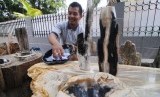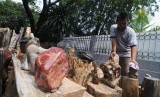 Pedagang fosil kayu, Wawan (31) menjajakan dagangannya di kawasan Kemang Dalam, Jakarta Selatan, Senin (3/11). (Republika/Raisan Al Farisi)