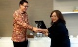 CEO Republika, Mira Djarot (kanan) menyerahkan cinderamata kepada Direktur Unit Usaha Syariah PermataBank, Achmad Kusna Permana (kiri) saat melakukan kunjungan ke Kantor Pusat PermataBank di Jakarta, Kamis (6/11). (Republika/Maman Sudiaman)