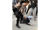 Polisi menahan seorang pengunjukrasa saat terjadi bentrokan antara mahasiswa dan polisi di depan kampus Universitas Indonesia Timur (UIT) Makassar, Sulsel, Jumat (7/11). (Antara/Yusran Uccang)