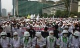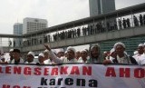 Sejumlah pengunjukrasa dari Front Pembela Islam (FPI), Laskar Pembela Islam (LPI) dan Forum Umat Islam (FUI) menggelar aksi unjuk rasa di Bunderan Hotel Indonesia, sebelum bertolak ke DPRD DKI, Jakarta, Senin (10/11). (Antara/Reno Esnir)