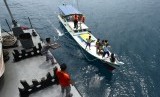 REPUBLIKA.CO.ID, BELITUNG TIMUR -- Sejumlah anak mengamati persenjataan KRI Barakuda 633 yang lego jangkar di lepas pantai Pulau Bukulimau, Belitung Timur, Babel, Senin (10/11).