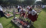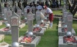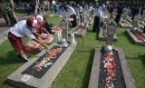 REPUBLIKA.CO.ID, JAKARTA -- Sejumlah siswa melakukan tabur bunga ke sejumlah makam pahlawan usai Upacara Ziarah Nasional di Taman Makam Pahlawan Nasional, Kalibata, Jakarta, Senin (10/11). (Republika/Agung Supriyanto)