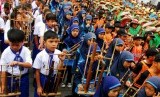 Sejumlah pelajar memainkan Angklung dalam rangka memperingati dikukuhkannya angklung sebagai representatif budaya tak benda warisan Indonesia oleh UNESCO di halaman Gedung Sate Bandung, Jawa Barat, Ahad (16/11). (Antara/Agus Bebeng)