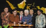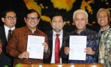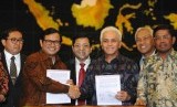 REPUBLIKA.CO.ID, JAKARTA -- Koalisi Merah Putih (KMP) yang diwakili oleh Hatta Rajasa dan Koalisi Indonesia Hebat (KIH) diwakili Pramono Anung, menandatangani kesepakatan damai disaksikan Pimpinan DPR Setya Novanto, Agus Hermanto, dan Fadli Zon di Gedung Nusantara IV, Kompleks Parlemen, Senayan, Jakarta, Senin (17/11).