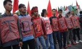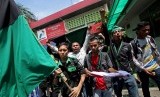 Massa aksi yang tergabung dalam Jaringan Mahasiswa Pejuang melakukan aksi unjuk rasa di depan Gedung Negara Grahadi, Surabaya, Jatim, Senin (17/11). (Antara/M Risyal Hidayat)