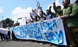 Pengunjuk rasa yang tergabung dalam Himpunan Mahasiswa Islam (HMI) Yogyakarta, melakukan aksi di depan kantor PT. Pertamina, Jl. Mangkubumi, Yogyakarta, Senin (17/11). (Antara/Noveradika)