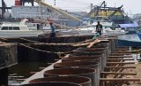 Pekerja mengerjakan proyek untuk tanggul penahan ombak di kawasan Pompa Air waduk Pluit, Jakarta Utara, Senin (24/11). (Republika/ Tahta Aidilla)