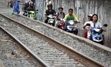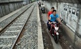 Sejumlah pengendara bermotor memanfatkan jalan sempit pinggiran rel kereta api untuk menyeberangi Banjir Kanal Barat di kawasan Grogol, Jakarta Barat, Selasa (25/11). (Republika/Rakhmawaty La'lang)