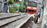 Seorang pengendara bermotor memanfatkan jalan sempit pinggiran rel kereta api untuk menyeberangi Banjir Kanal Barat di kawasan Grogol, Jakarta Barat, Selasa (25/11). (Republika/Rakhmawaty La'lang)