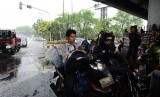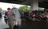 Lebih dari separuh badan jalan tertutup akibat para pengendara yang berteduh, sehingga menimbulkan kemacetan arus lalu lintas.