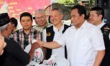 Menteri Perdagangan Rachmat Gobel, Menteri PAN dan RB Yuddy Chrisnandi dan pendiri Artha Graha Tomy Winata membagikan sembako saat pembukaan pasar murah di Jakarta,Ahad (30/11). (foto : mgROL29)
