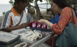 Wisatawan mancanegara melihat sejumlah perhiasan dari mutiara yang dijual di pinggir Pantai Sengigi, Batu Layar, Lombok Barat, NTB, Senin (8/12) (Antara/Widodo S. Jusuf)