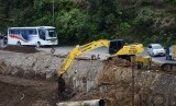 Alat berat melakukan proses pengerukan galian tanah di kawasan rawan longsor perbatasan antara Bogor dan Cianjur, Jawa Barat, Jumat (12/12).( Republika/Raisan Al Farisi)