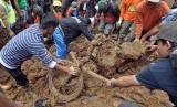 Selain mengevakuasi korban longsor, relawan juga mengevakuasi ternak serta bangkai sepeda motor yang tertimbun tanah longsor.
