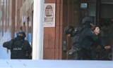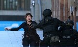 Sejumlah polisi bersenjata lengkap mengamankan seorang wanita yang berhasil melarikan diri dari penyanderaan di sebuah kafe di Sydney, Senin (15/12). (AP/Rob Griffith)