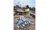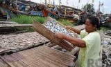 REPUBLIKA.CO.ID, JAKARTA -- Warga menjemur sisa tangkapan ikan yang akan dijadikan ikan asin berlatar belakang perahu nelayan yang ditambatkan di kawasan kampung nelayan Muara Angke, Jakarta, Selasa (16/12).