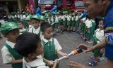 REPUBLIKA.CO.ID, JAKARTA -- Petugas pemadam kebakaran mengenalkan sejumlah alat pemadam api kepada asiswa TK Islam Mardiyatullah di Pos Pemadam Kebakaran Johar Baru, Jakarta Pusat, Selasa (16/12).
