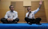 Wakil Ketua KPK Busyro Muqoddas bersama Juru Bicara KPK, Johan Budi berdialog dengan wartawan saat acara perpisahan Busyro di Gedung KPK, Jakarta, Selasa (16/12). (Republika/Agung Supriyanto)