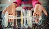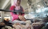 Penjual menunjukkan perhiasan berupa mutiara air tawar yang dijual di sentra pusat perhiasan mutiara di Kawasan Sekarbela, Mataram, Nusa Tenggara Barat, Ahad (21/12).( Republika/Raisan Al Farisi)