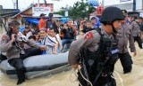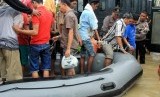 REPUBLIKA.CO.ID, LHOKSUKON -- Polisi mengawal sejumlah narapidana turun dari perahu karet ketika melakukan evakuasi akibat lapas tempat mereka dibina terendam banjir di Lhoksukon, Aceh Utara, Aceh, Selasa (23/12).