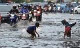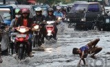 REPUBLIKA.CO.ID, JAKARTA -- Pengguna kendaraan bermotor melintasi genangan air di Jalan Cikini Raya, Jakarta Pusat, Jumat (26/12).