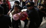 Seorang keluarga penumpang pesawat AirAsia QZ 8501 jatuh pingsan dan digotong petugas, usai mendengar kabar ditemukannya serpihan pesawat, di Bandara Internasional Juanda, Surabaya, Selasa (30/12). (Reuters/Beawiharta)