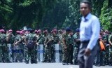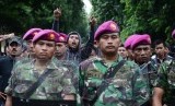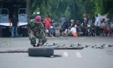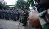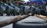 REPUBLIKA.CO.ID, JAKARTA -- Warga bersama anggota Marinir bersenjatakan tameng dan pentungan menjaga lahan di kompleks TNI AL, Boulevard, Kelapa Gading, Jakarta Utara, Rabu (14/1).
