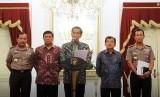 REPUBLIKA.CO.ID, JAKARTA -- Presiden Joko Widodo memberikan keterangan pers didampingi Wapres Jusuf Kalla, Menko Polhukam Tedjo Edhy Purdijatno, Kapolri Jenderal Pol Sutarman, dan Wakapolri Komjen Pol Badrodin Haiti di Istana Merdeka, Jakarta, Jumat (16/1).