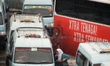 Penumpang berjalan di antara deretan mikrolet di Terminal Kampung Melayu, Jakarta Timur, Senin (19/1).(Republika/Prayogi) (FOTO : Republika/Prayogi)